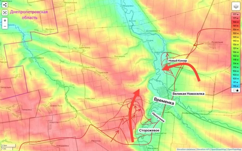 "Между тем, сейчас у частей противника в этом районе, остается пожалуй, последняя возможность это сделать. И это стало следствием крайних успехов ВС РФ западнее реки Мокрые Ялы. Где они последовательно берут под контроль холмы над Нескучным и Времеевкой. Причем, даже та грунтовая дорога, по которой, пусть и под непрекращающимся огнем ещё можно как-то проникать в Большую Новоселку и выбираться из неё, уже практически находится под огнём из стрелкового оружия (правда, на предельных дистанциях)", - пишет эксперт.