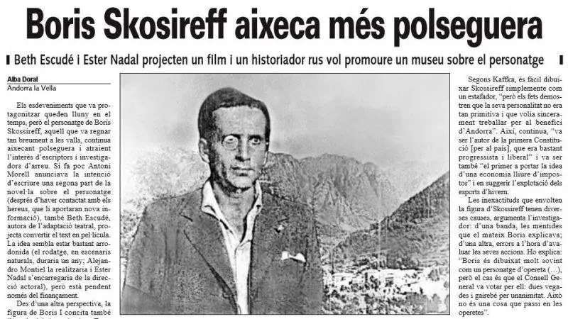 Князь или даже король, которым парламентарии избирают, конечно же, Бориса Скосырева. В конце 1933 года он становится Борисом I Андоррским, но его, естественно, не признают ни во Франции, ни в Испании, ни где-нибудь ещё. И хотя реализация бизнес-проекта «Курорт Андорра» уже начинается, пробиваются горнолыжные трассы, строятся гостиницы, отряд испанской гражданской гвардии берёт нового монарха под стражу.