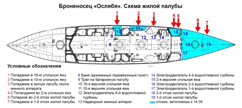Для наглядного восприятия информации о повреждениях «Осляби», распространении воды и действиях экипажа автор подготовил несколько схем.