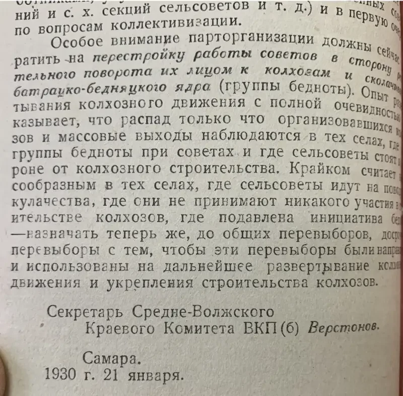 Второй экземпляр этого же села Селиванов Давид Никифорович внесен в списки к выселению за то, что не внес наложенную на него сумму на трактора. Сам же он принадлежит к разряду бедняков, до революции работал батраком в имении Агапова, в прошлом и настоящее время исправный плательщик налогов и ярый защитник всех мероприятий сов. власти. Подобные факты свойственны каждому селу. Райком и Райштаб слишком несерьезно относились к тем процессам, происходящим на селе, не занимались проверкой присылаемого материала…»