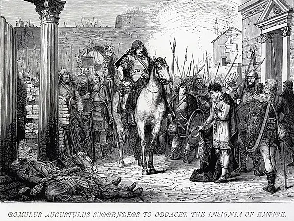 Германец Одоакр низлагает молодого императора Ромула Августула в 476 году. Бывший император Ромул Августул (Romulus Augustulus) все еще находился в Равенне, и Одоакр отправил его в изгнание. Судьба Августула, последнего императора Западной Римской империи, неизвестна, но считается, что Одоакр его сослал на виллу Лукулла в Кампании (регион в южной части Италии, Неаполь). Сослав молодого императора, отправив инсигнии императорской власти в Константинополь и став первым королем (rex) Италии, Одоакр тем самым поставил жирную точку на существовании всей Западной Римской империи. Его правление длилось более шестнадцати лет, характеризуясь уникальным сочетанием варварских и римских практик