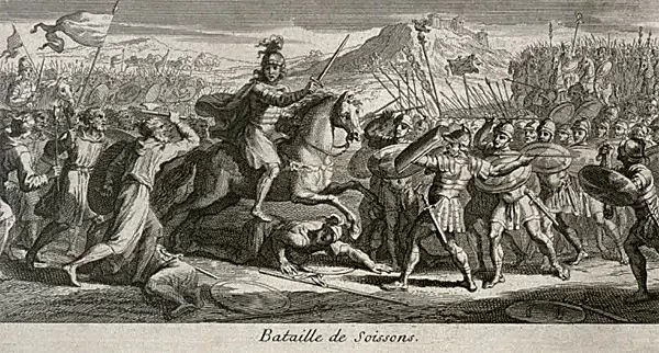 Сражения при Суассоне. Винтажная иллюстрация. Результатом этого сражения был конец Суассонского королевства, которое было ассимилировано во Франкское королевство, которое к 555 году н.э. уже включало в себя всю Галлию, а варварские германские королевства, которые первоначально параллельно сосуществовали с римскими структурами, начали принимать и адаптироваться под римские законы, объединяясь в единую культурную общность. Это явление романизации германцев и германизации галло-римлян было ключом к формированию будущей политической и культурной идентичности в Западной Европе.
