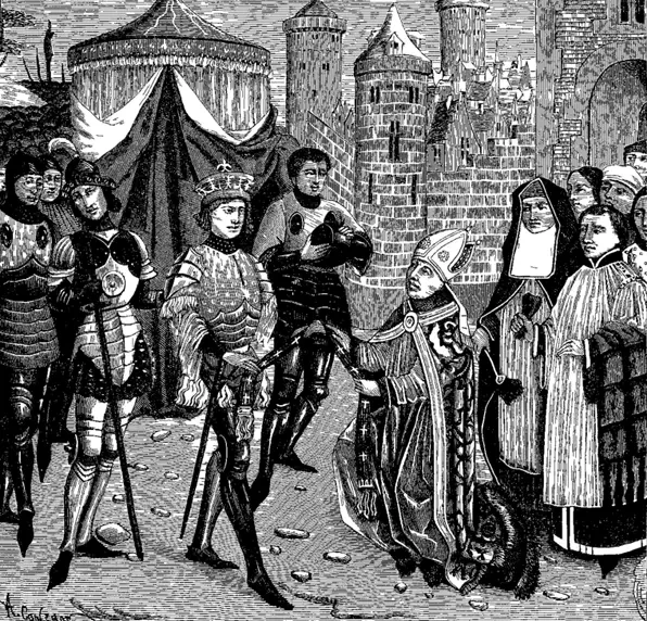 На этом изображении Святой Ремигий, епископ Реймса, приходит просить Хлодвига, который в то время ещё не принял христианство, о возвращении священной чаши, которая хранилась в соборе в Суассонском королевстве, захваченной франками при разграблении ими Суассона. Винтажная иллюстрация. Рисунок по мотивам средневековой миниатюры. Источник: Digital Vision Vectors.