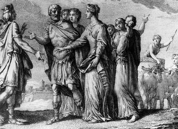 Встреча франкского короля Хлодвига с Клотильдой (Хродехильдой), дочерью бургундского короля Хильперика II и племянницей короля бургундов Гундобада. 493 год. Если верить летописям Григория Турского, то король выдал Клотильду за Хлодвига, боясь отказать могущественному франкскому королю. Гравюра Бернара Франсуа Леписи (1698-1755) и Жака-Филиппа Ле Ба (1707-1783). Источник: De Agostini Editorial