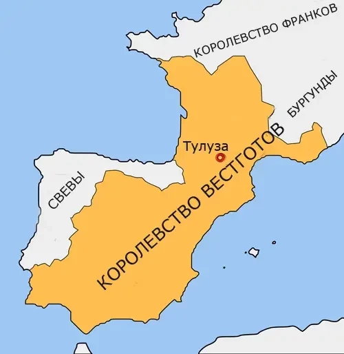 Политическая карта Западной Европы перед войной франков с вестготами. Королевство вестготов - объединение германских племен, созданное с согласия Римской империи в 418 году н. э. В рамках соглашения со слабеющим Римом, вестготы были обязаны были оказывать Риму военную поддержку, но после падения Рима, королевство вестготов разорвало политические связи с павшей Римской империей. Бургунды - такое же объединения германских племен, но в отличие от других германцев, не играли никакой роли в подрыве Римской империи. Они жили среди римлян и имели свои собственные обычаи. Все эти варварские королевства - Вестготское и Бургундское, использовали монархию в качестве своей политической структуры...