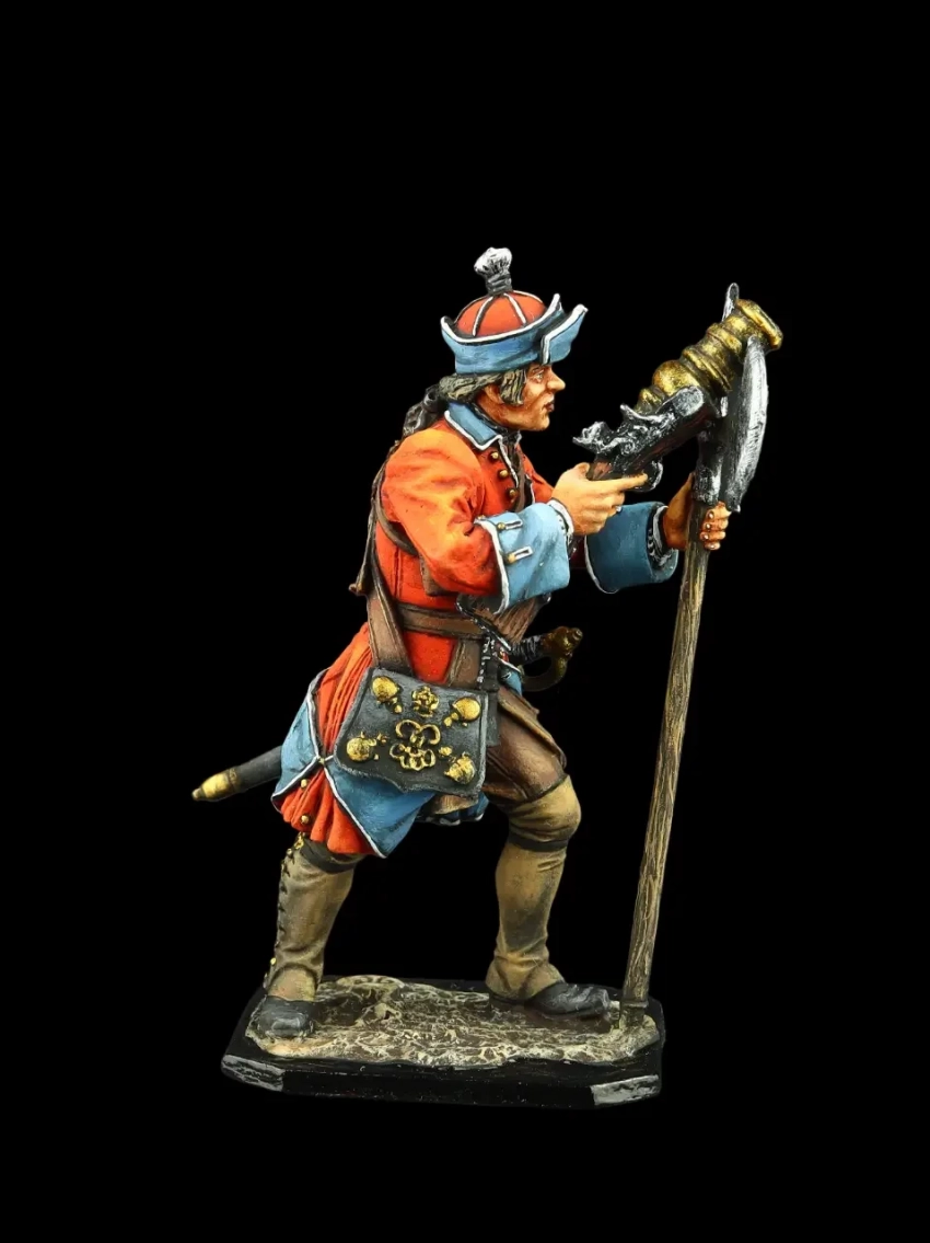 Гренадер 2-го Выборного (Бутырского) полка, 1698-1702 гг. Каждому гренадеру полагалось две двухфунтовые (ок. 800 г) чугунные фитильные гранаты в специальной сумке через плечо. В качестве головного убора гренадеры обычно носили высокие остроконечные колпаки, которые, в отличие от широкополых шляп и треуголок, не мешали ему забрасывать за спину на ремне мушкет, освобождая руки для метания гранат. Производители: «Silver Dream Studio» и «EK Castings».