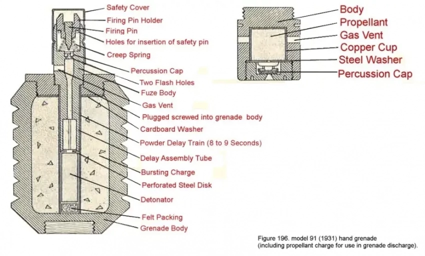 - осколочная граната типа 91, весом 0,53 кг + метательный заряд 1 типа