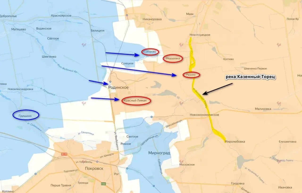 Как отмечает Машовец, план Сырского подразумевает прорыв обороны ВС РФ на линии Затишок (Суворово) – Фёдоровка – Разино – Красный Лиман, занятие Родинского и тем самым прорваться к Покровску, разблокировать его. Однако российское командование создало мощный укрепрайон в районе Разино, а также постоянно шлют подкрепления в район Красного Лимана и Суворово. Одновременно с этим ВС РФ готовят удар на Гришино, который окончательно поставит крест на планах Сырского. К тому же у ВС РФ превосходство в силах.