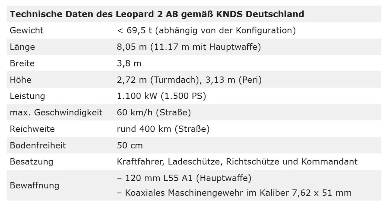 Leopard 2A8 – это полностью переработанный по сравнению со своими предшественниками танк, боевая масса которого составляет около 70 тонн. Его основным вооружением является 120-мм орудие L55A1 от Rheinmetall, уже используемое в вариантах A7V и A7A1. Эта пушка позволяет вести огонь как программируемыми ОФС, так и новейшими кинетическими боеприпасами (при их попадании цель уничтожается исключительно за счёт огромной кинетической энергии выстрела, без ВВ в поражающей части).