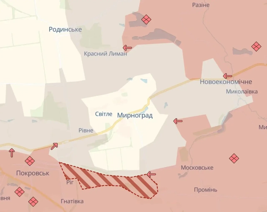 Украинские мониторинговые паблики вступают в заочную полемику с главкомом Сырским, заявляющим, что в Покровске и Мирнограде «ситуация сложная, но контролируемая». Связанный с ГУР Украины инфоресурс DS представляет свои карты, в титрах под которыми констатирует, что контроля давно нет. При этом тот же паблик пытается играть в традиционный «антикриз», отмечая на карте контуры серой зоны, вызывающие вопросы даже среди украинских пользователей.