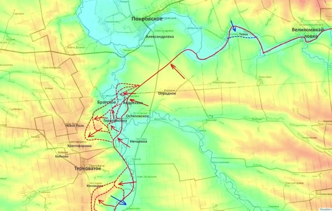 Продвижение наблюдается также в направлении Терноватого - с двух сторон, из Герасимовки и Доброполья, с целью выхода в тыл противнику.