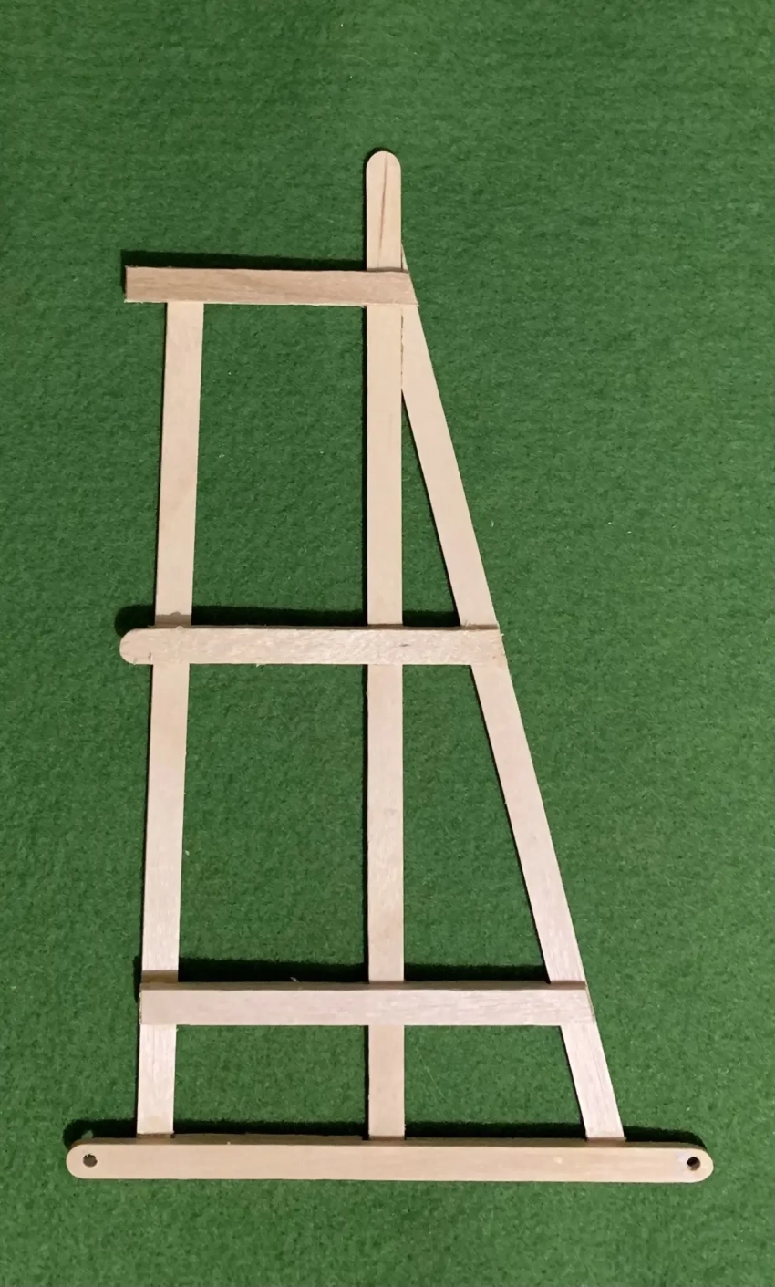 Теперь смотрим на фотографию, на которой приведена основная боковая проекция осадной башни, причем уже склеенная из палочек-мешалок. Ее следует сканировать или сфотографировать, а затем распечатать так, чтобы ширина палочек на ней оказалась равной тем, что вы имеете. Можно заранее сделать из них «балки»: склеить между собой три палочки, после чего на листе наждачной бумаги, положенном на ровную поверхность, аккуратно зачистить их боковые стороны.
