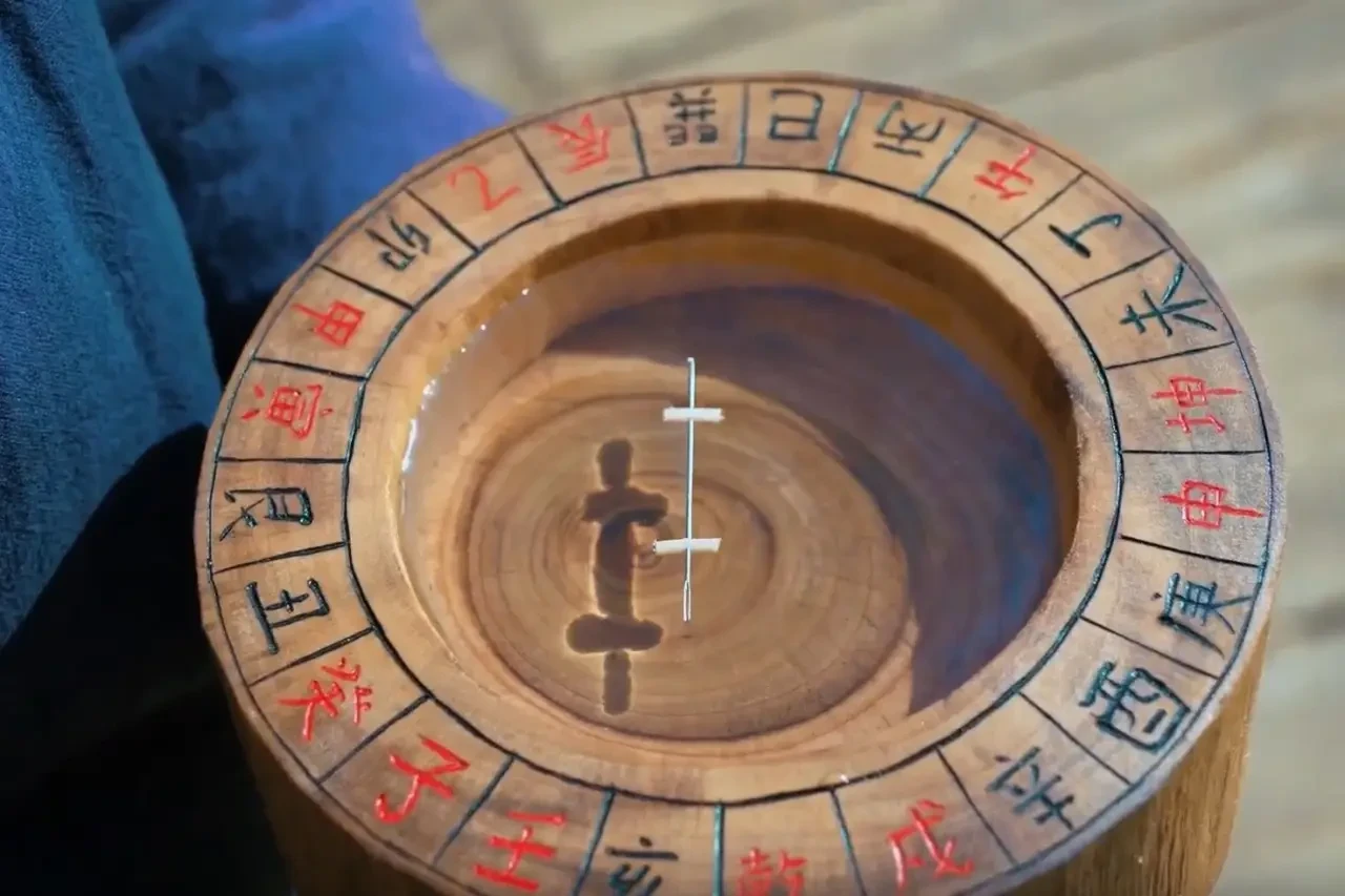 Впервые такая плавающая стрелка, указывающая направление на юг, появилась в XI веке. На намагниченную металлическую иглу накалывались кусочки чего-либо (полотна), способного держаться на поверхности воды. Когда она свободно плавала в сосуде, ее кончик неизменно указывал в сторону полюса. Иногда вместо иголки использовалась металлическая фигурка в форме рыбки.