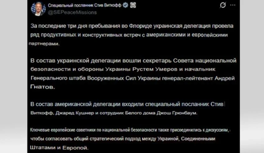 Серьёзность подчёркивает одновременный визит в Майами украинской делегации во главе с Рустемом Умеровым плюс советники по нацбезопасности из Британии, Франции и Германии - главных спонсоров Киева. Уиткофф и Умеров синхронно написали в X о "продуктивных переговорах за три дня". Европа подключилась - шансы на сделку растут.
