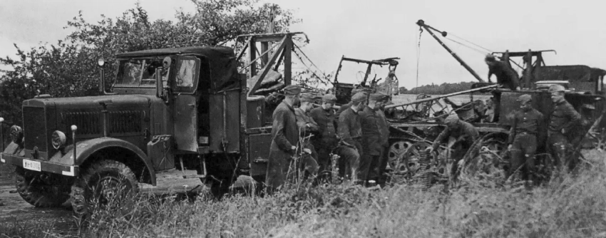 Восстановление собственной брошенной или повреждённой техники. На фото эвакуируют средний тягач грузоподъёмностью 5 тонн mittlerer Zugkraftwagen 5t (Sd.Kfz. 6) ранней модификации