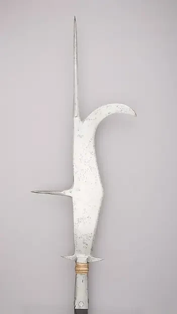 Гвизарма 1500 г. Тут тебе и протыкающие кольчугу и доспехи шипы, и крюк, сбрасывать всадников с коня и рубящий клинок. Такое вот страшное универсальное оружие пехотинца. Метрополитен музей, Нью-Йорк