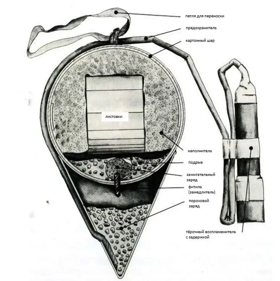 Пороховой заряд был способен забросить шар с листовками на расстояние до 500 м. На излете шар разрывался (внутри него также был небольшой пороховой заряд с замедлителем), и листовки свободно планировали на землю.