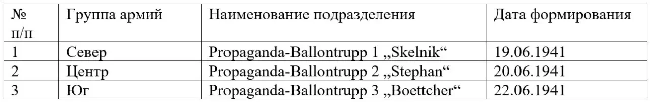В своих статьях исследователь военной пропаганды Николай Смирнов рассказывает, что также для распространения листовок над тыловыми районами СССР и для воздействия на население крупных советских городов применялись агитационные воздушные шары, ранее успешно показавшие себя в 1940 г. при пропаганде на население Британских островов. Специально для действий на Восточном фронте было создано 3 именных отделения агитационных воздушных шаров, придававшихся группам армий (Север, Центр, Юг).