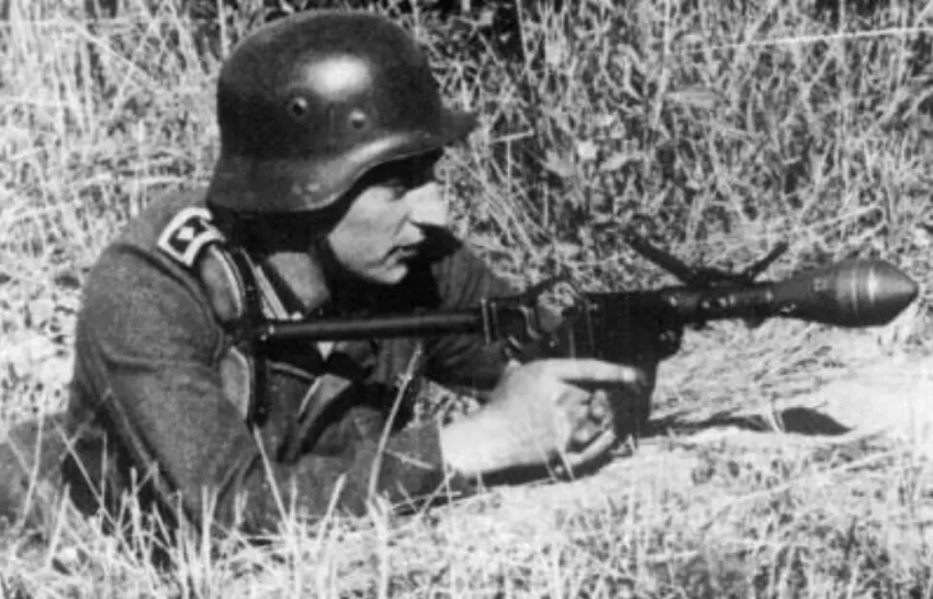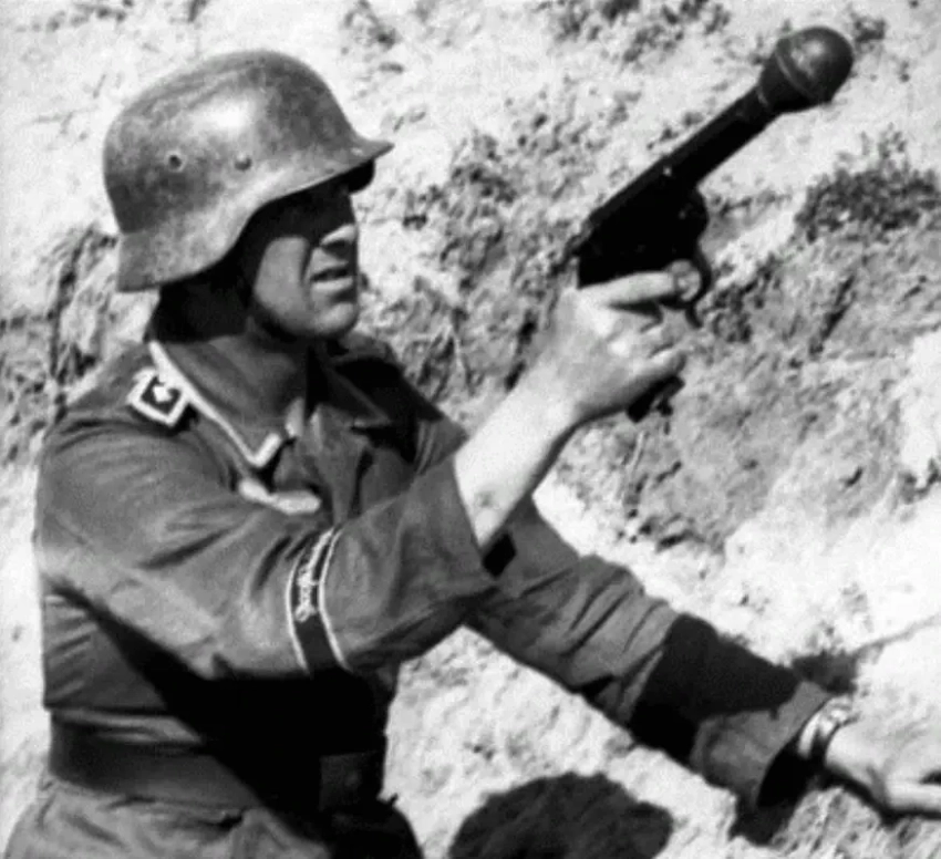 Солдат вермахта целится из пистолета Sturmpistole с плечевым упором (граната осколочная)
