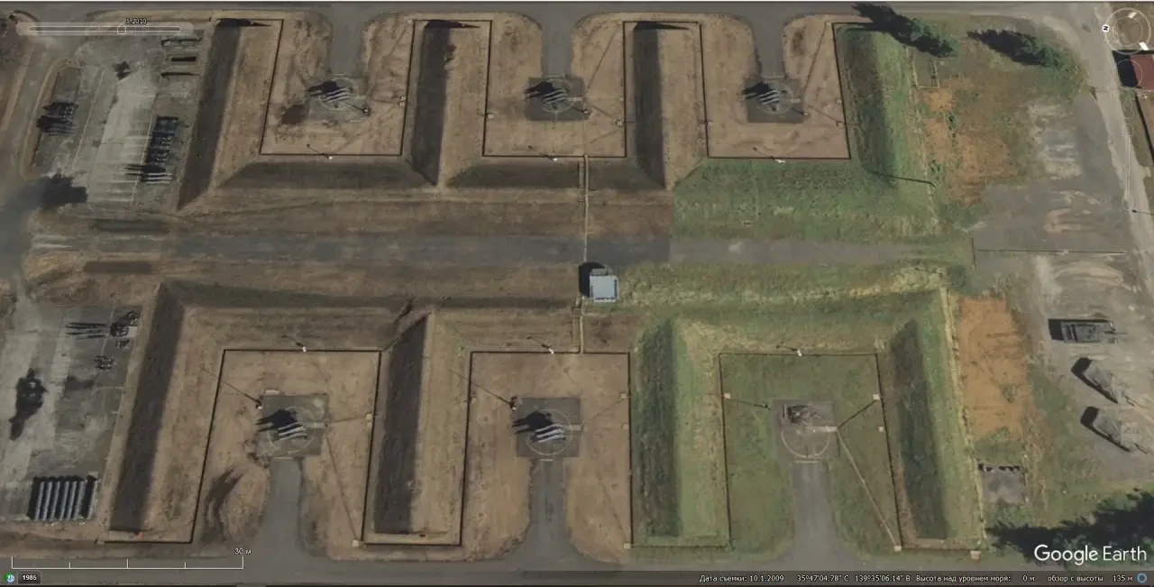 Спутниковый снимок Google Earth: позиция ЗРК Hawk Type III на военной базе Симошизу в Токио. Снимок сделан в феврале 2008 года