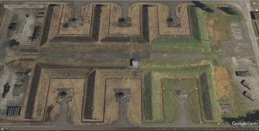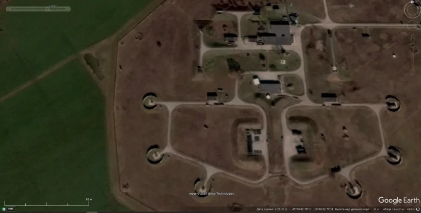 Спутниковый снимок Google Earth: элементы ЗРК MIM-14 Nike Hercules на базе хранения в западном пригороде города Падуя. Снимок сделан в мае 2009 года