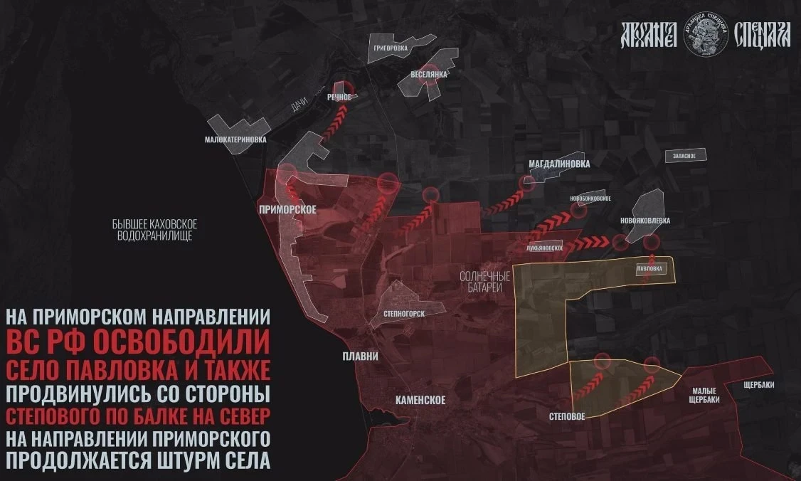 На Запорожском участке продолжаются бои в районе Приморского, Речного и в направлении Веселянки. В районе Павловки ВС РФ укрепляют позиции. В районе Орехова позиционные бои. В Каменке-Днепровской ВСУ обстреляли школу, в которой находились ученики и сотрудники, чудом никто не пострадал.