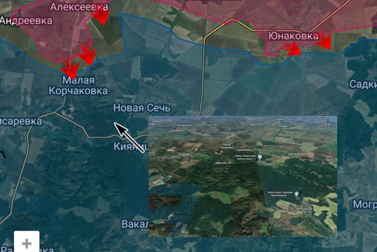 В районе Алексеевки мотострелки продвигаются к Малой Корчаковке, преодолевая сопротивление в лесных массивах на высотах. Несмотря на превосходство ВСУ в тяжёлых дронах («Баба Яга», R-18), российская артиллерия и авиация эффективно уничтожают позиции противника.