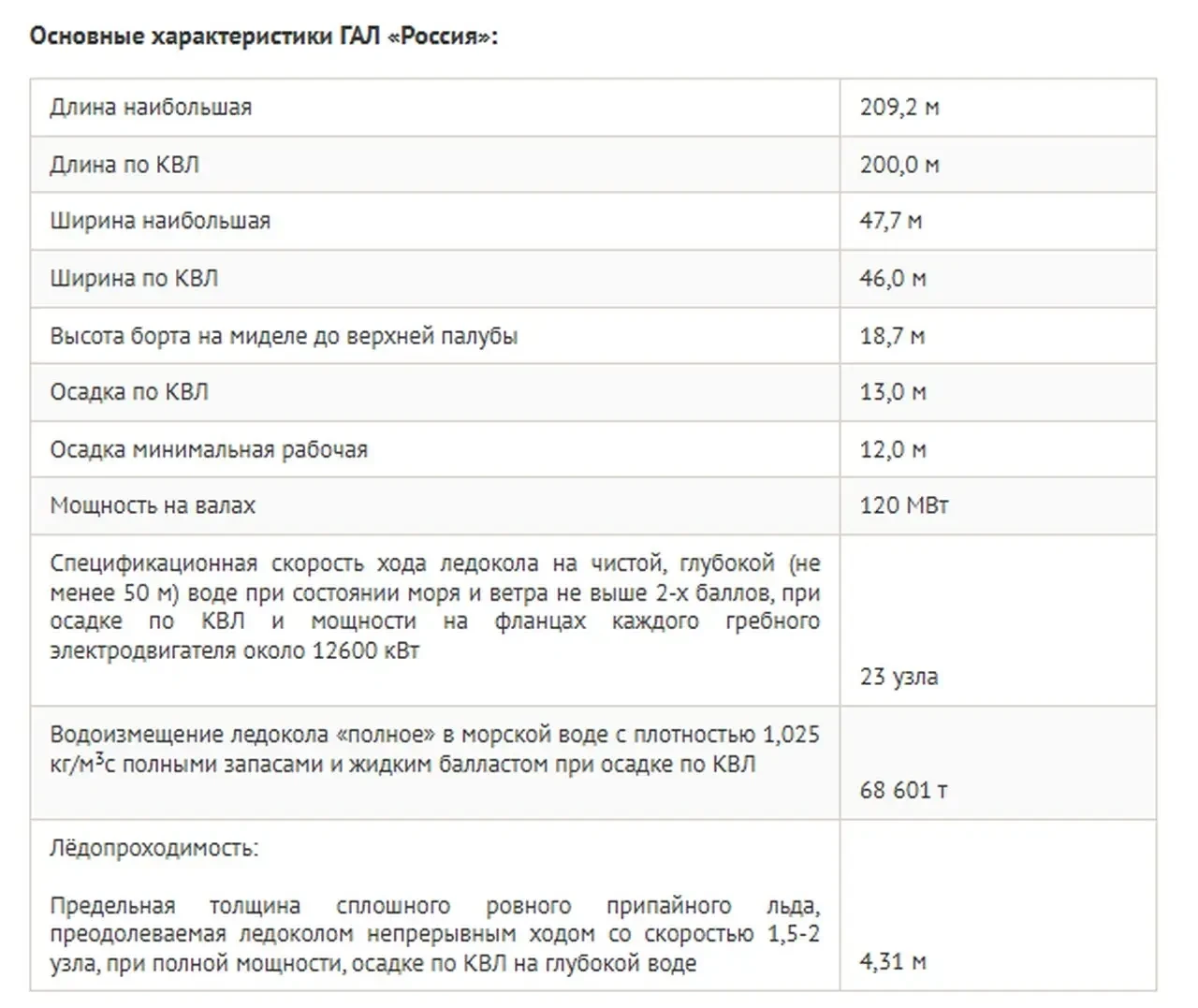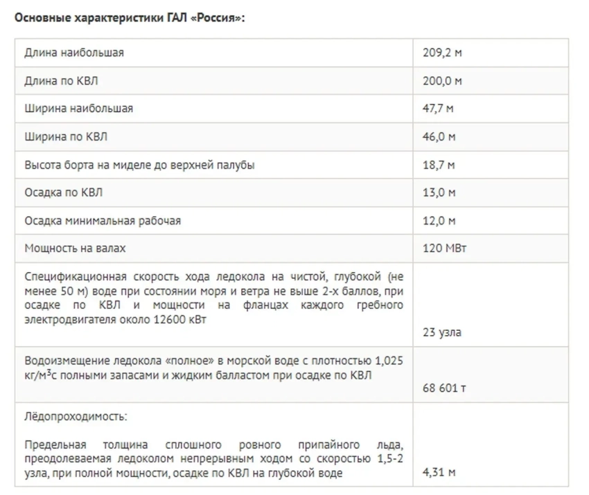 Отмечается, что «Лидер» предназначен для проводки судов через двухметровый лёд со скоростью около 11 узлов: