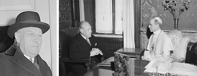Авиационный вояж в октябре-ноябре 1936 года кардинала Эудженио Пачелли (будущий Папа Пий XII) по Соединенным Штатам, за что его прозвали «Летающим кардиналом». На фото слева: встреча кардинала Эудженио Пачелли с Джозефом Кеннеди (бизнесменом, будущим послом и отцом будущего президента Джона Кеннеди) во время своей дипломатической миссии в Америке в 1936 году