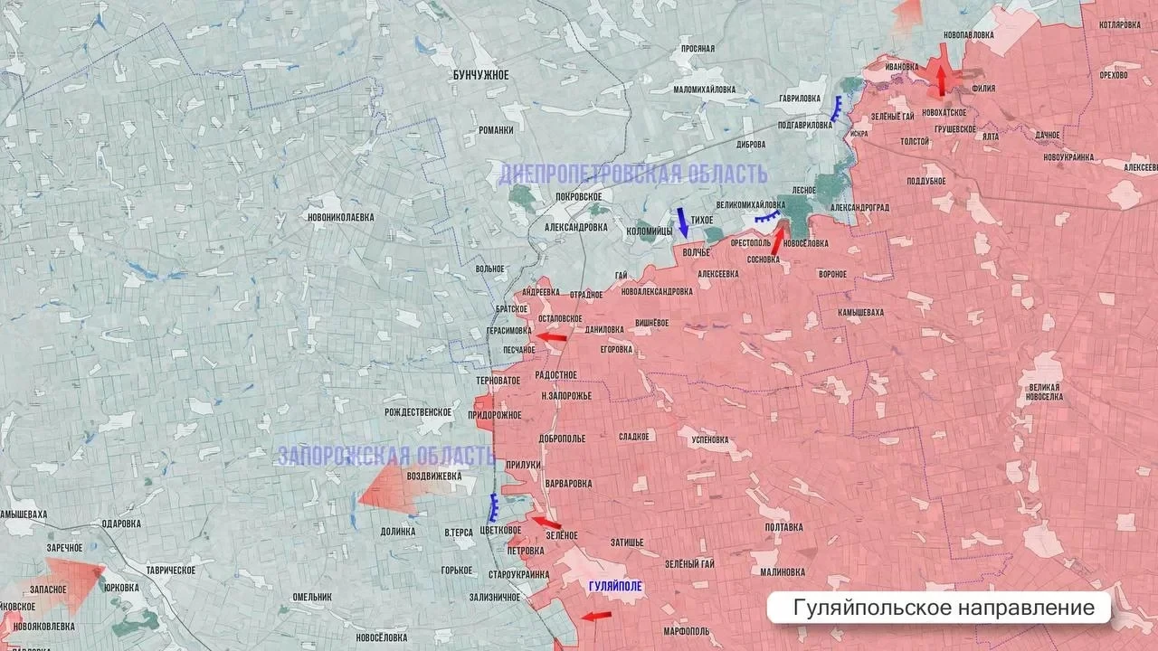 Особого внимания заслуживает Гуляйпольское направление. Здесь российские подразделения заняли ряд стратегически важных позиций у Староукраинки. Развивая успех, наши штурмовые группы выходят к южным окраинам Цветкового и поджимают противника с севера у Зализничного.