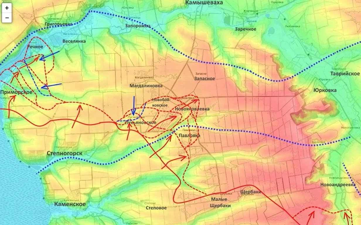 «Мы прорвали главную линию обороны, которую противник возводил на протяжении нескольких лет, которая была у него здесь главной. И опять же, опасность нашего дальнейшего движения на Камышеваху, а также переправа через реку Конка, а там далее уже буквально чуть более 10 км до окраин Запорожья. ВСУ получили команду нанести контрудар. С учётом того, что опереться противник на южном берегу реки Конки мог только на Веселянку и Магдалиновку, именно сюда перегруппировалась часть штурмовых полков, которые были переброшены с севера, и первый удар, который был нанесён, - по Лукьяновскому, в основание нашего выступа», - отметил блогер.