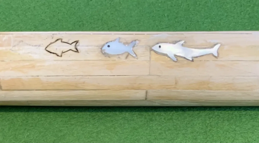 Вырезались фигурки из перламутрового диска так: сначала по периметру насверливались отверстия диаметром 0,5 мм, затем они рассверливались сверлом толщиной 1 мм. Вырезанные таким образом вставки-фигурки рыб и птицы обтачивались алмазным диском и зубными борами всё той же микродрелью. Диски диаметром 2 мм покупные. Это набор позиционных маркеров для грифа гитары, сделать их самостоятельно я даже и пытаться не стал. Вставки раскладывают на корпусе и обводят остро заточенным карандашом. Места для вставок диаметром в 2 мм лучше рисовать фломастером, используя прозрачную линейку с отверстиями. Тогда все они будут на одинаковом расстоянии друг от друга. Посадочные гнезда под них высверливаются двухмиллиметровым сверлом. Ставить их лучше всего на суперклей так, чтобы они, пусть и немного, приподнимались бы над поверхностью корпуса пироги.