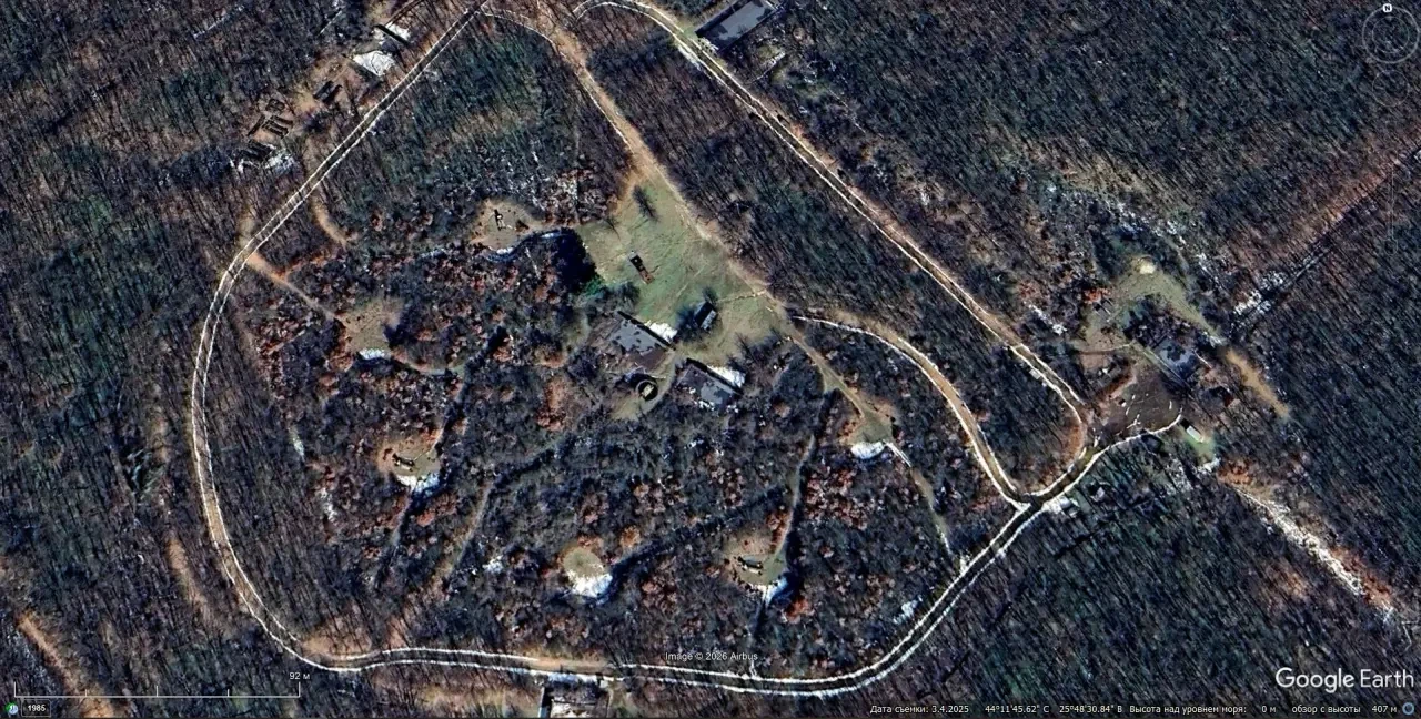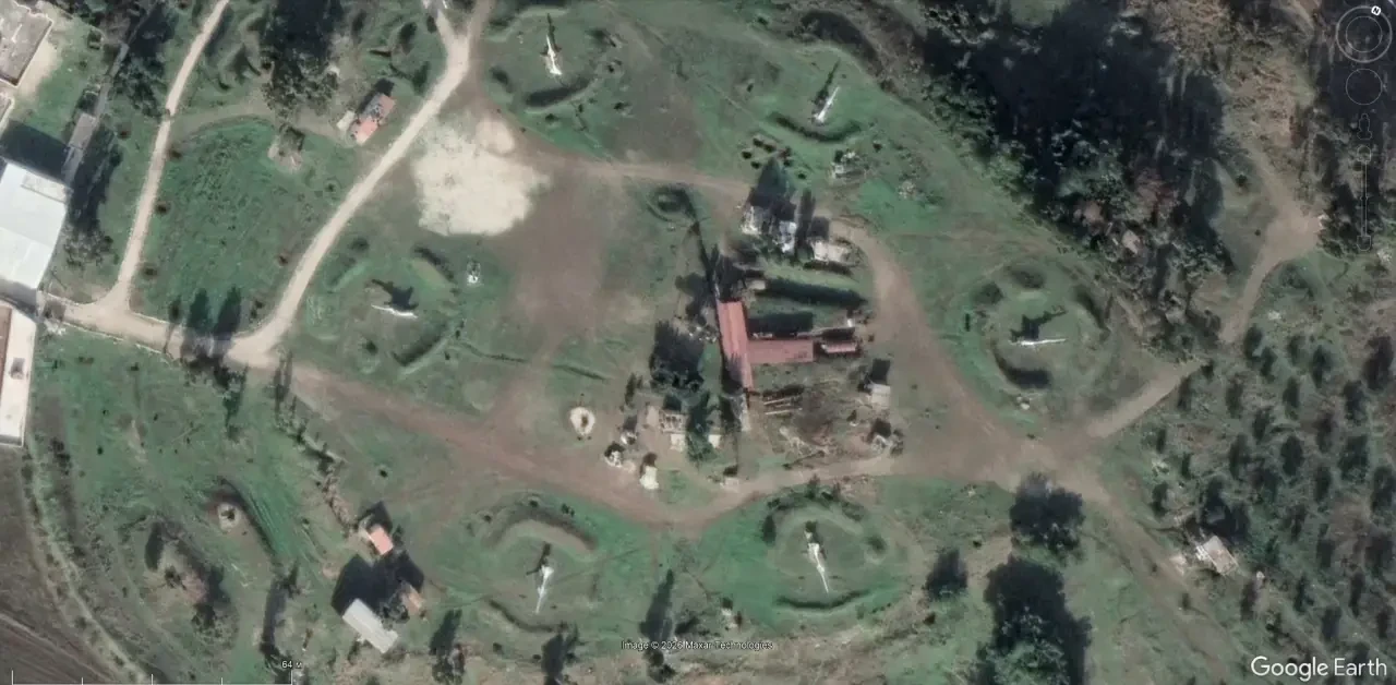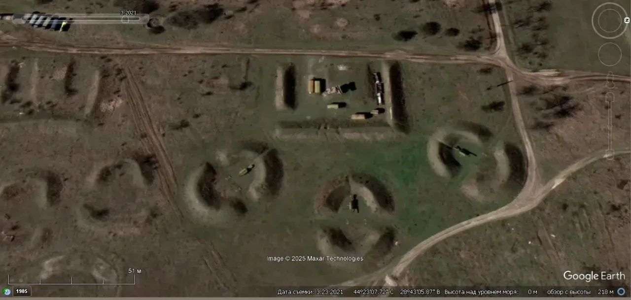 Спутниковый снимок Google Earth: позиция румынского ЗРК С-75М3 к югу от Бухареста. Зенитных ракет на пусковых установках нет. Снимок сделан в марте 2025 года