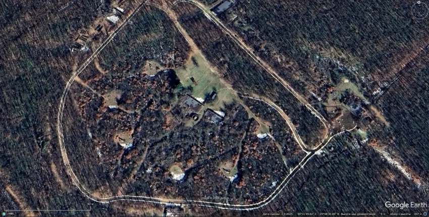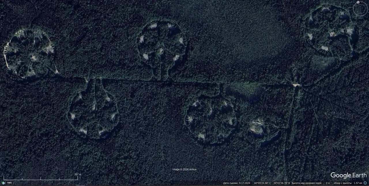 Спутниковый снимок Google Earth: заброшенная позиция ЗРК «Даль» неподалёку от Ржевского полигона в Ленинградской области. Снимок сделан в сентябре 2024 года