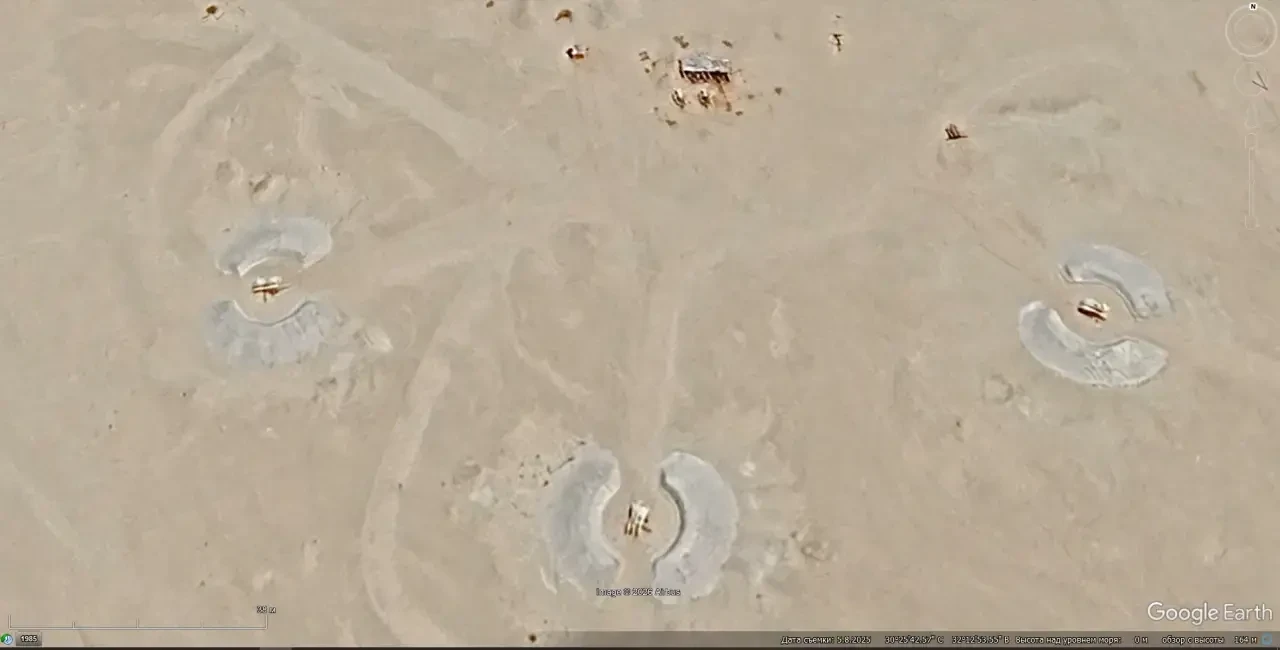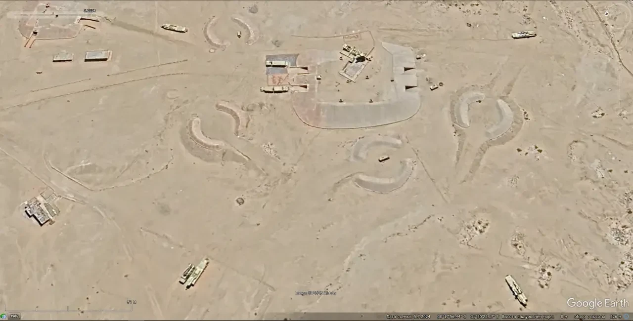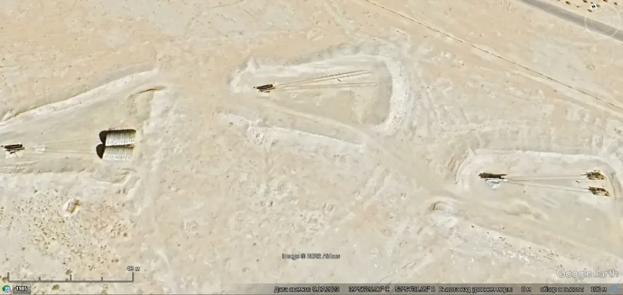 Спутниковый снимок Googlе Еаrth: пусковые установки туркменского ЗРК С-200ВМ развернутого в 10 км западней Туркменбаши. Снимок сделан в сентябре 2023 года