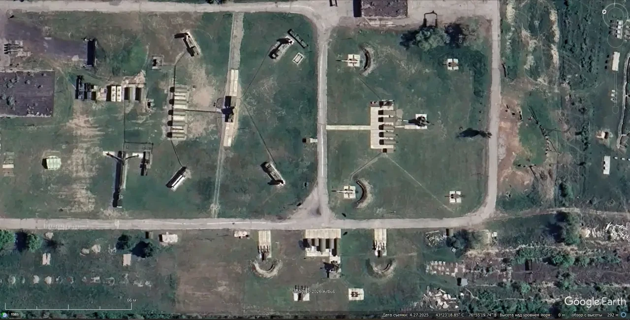 Спутниковый снимок Google Earth: ЗРК С-75М3, С-125М1 и С-300ПС на территории Военно-инженерного института радиоэлектроники и связи Министерства обороны Республики Казахстан. Снимок сделан в апреле 2025 года
