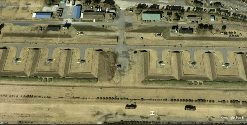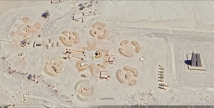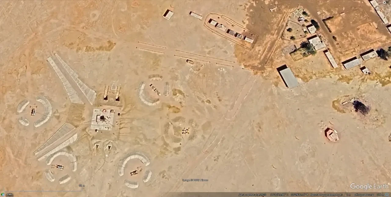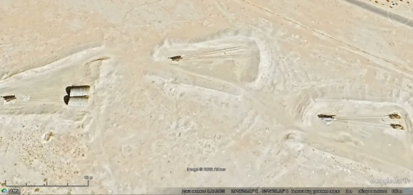Спутниковый снимок Google Earth: позиция ЗРК С-125, расположенная рядом с Мемориалом обороны Суэцкого канала. Слева от позиции ЗРК расположена зенитная артиллерийская батарея. Снимок сделан в июне 2025 года