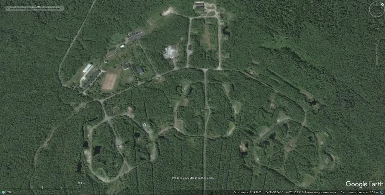 Спутниковый снимок Google Earth: заброшенные позиции ЗРК С-200ВМ под Северодвинском. Снимок сделан в июле 2003 года