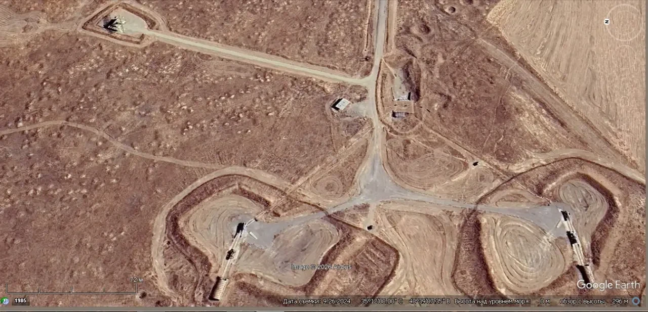 Спутниковый снимок Google Earth: позиция ЗРК С-200ВЭ неподалеку от авиабазы Хамадан. Рядом с ПУ расположена РЛС дежурного режима. Снимок сделан в сентябре 2024 года