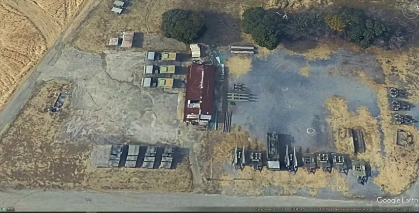 Спутниковый снимок Google Earth: пусковая установка ЗРК Hawk Type III среди другой военной техники в учебном центре 7-й бронетанковой дивизии в пригороде Титосе. Снимок сделан в июле 2025 года