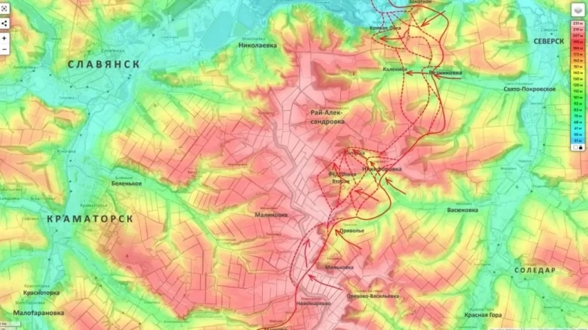Основной акцент в текущей сводке сделан на стремительном развитии событий вокруг Славянско-Краматорской агломерации. Российские штурмовые подразделения инициировали бои за населённый пункт Каленики и вплотную подошли к Рай-Александровке.