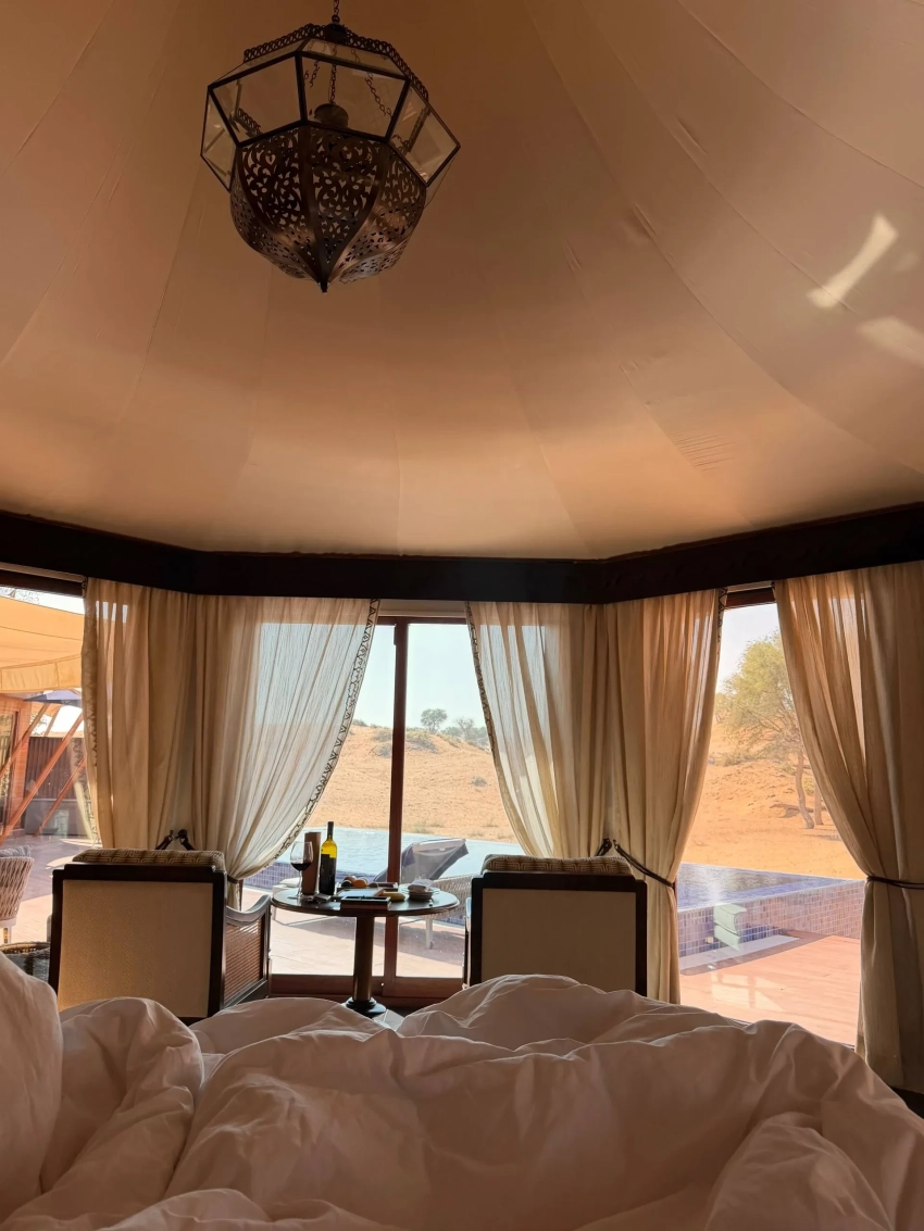 Похоже, влюблённые поселились в домике прямо в пустыне. Они сразу отправились рассекать по дюнам на багги и встречать закат. Чтобы прочувствовать местную атмосферу, Перминова также сделала роспись мехенди.