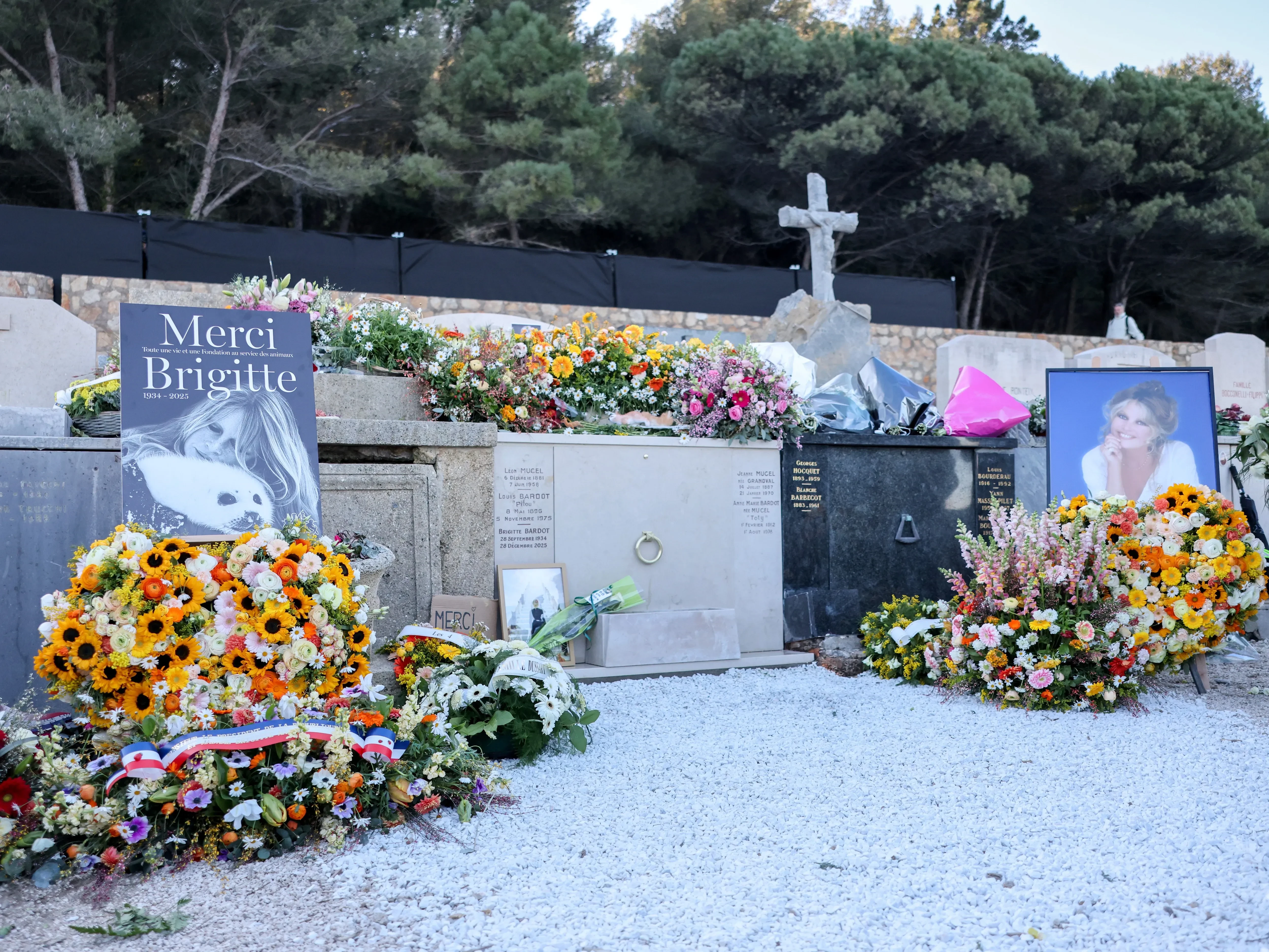 На похороны Брижит Бардо пришли её друзья, коллеги, зоозащитники, муж, а также 65-летний сын Николя-Жак Шарье со своей семьёй: женой Анне-Лине Бьеркан, дочерьми Анной и Теей и внуками.
