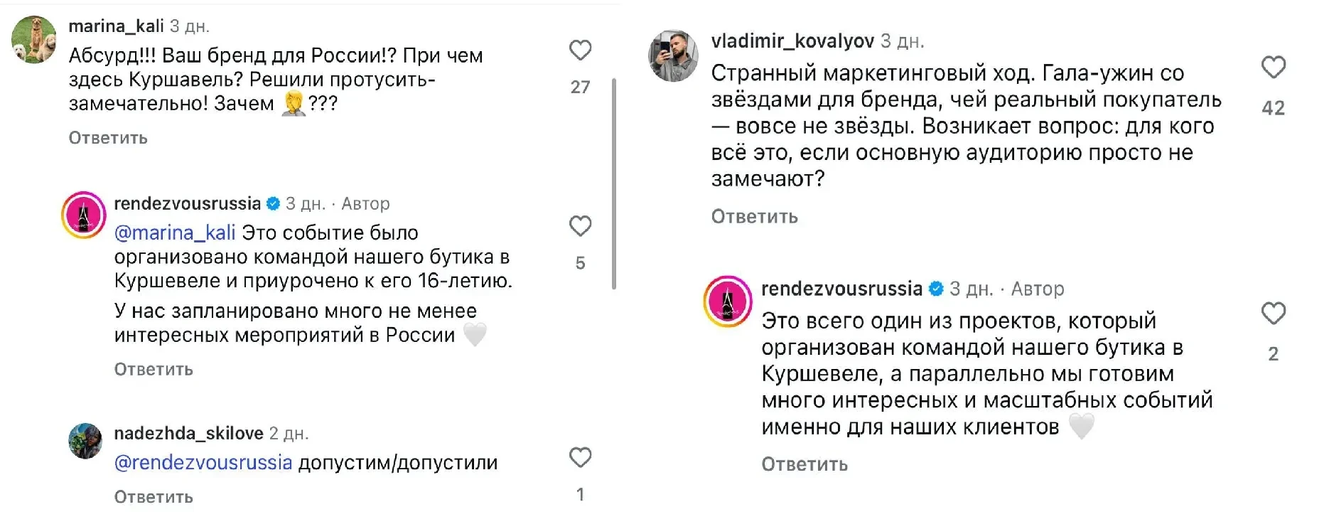 В компании попытались объяснить мероприятие тем, что его организацией занимался их бутик в Куршевеле и что для клиентов будут другие "интересные" выезды. При этом неудобные вопросы, как, например, о том, почему деньги, которые потратили на мероприятие, не направили на гуманитарную помощь, администрация якобы удаляет. И критики меньше не стало.