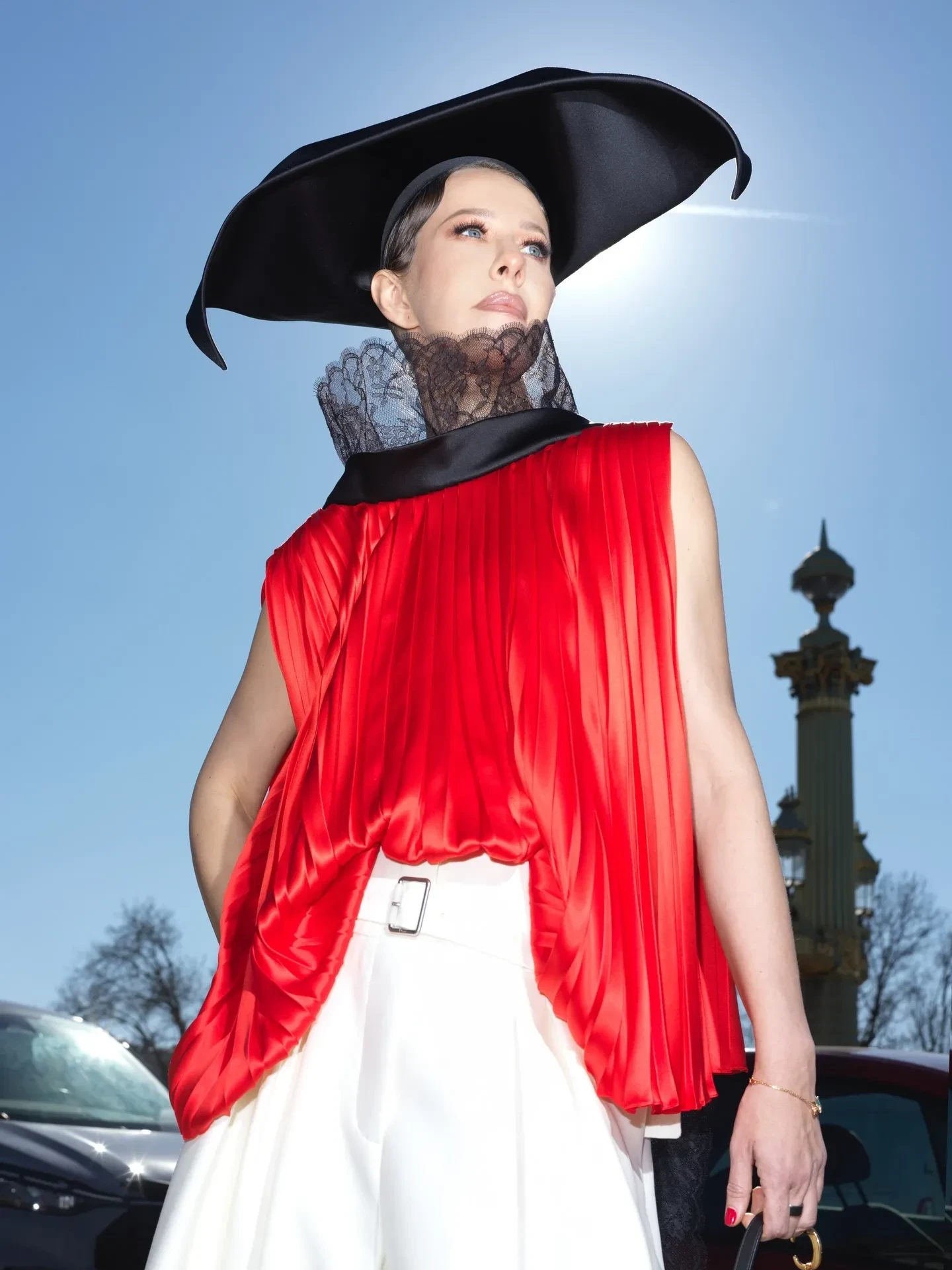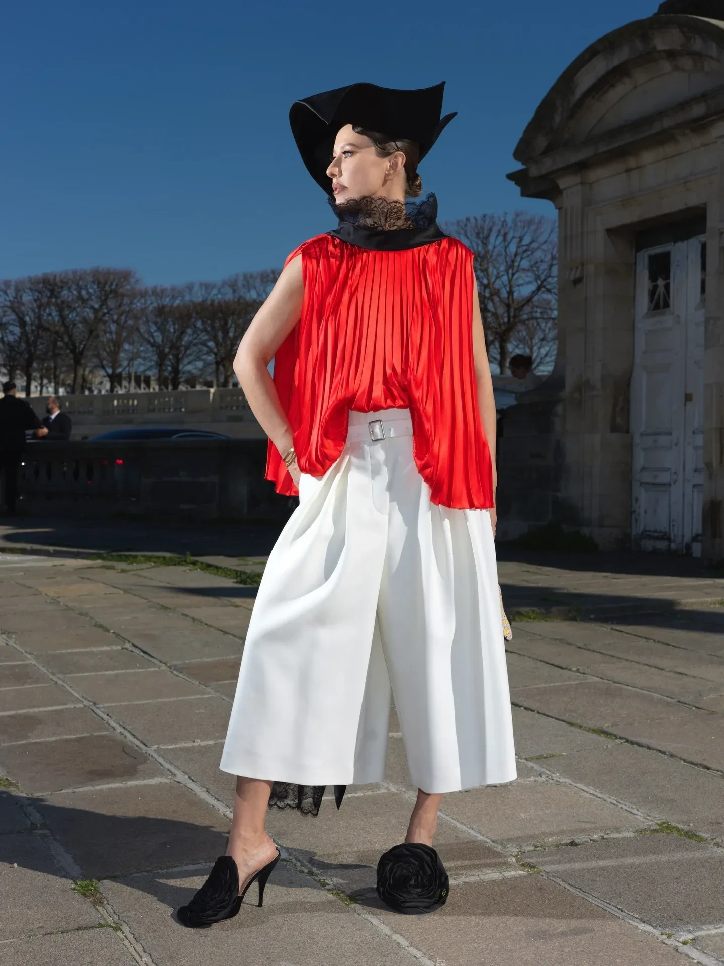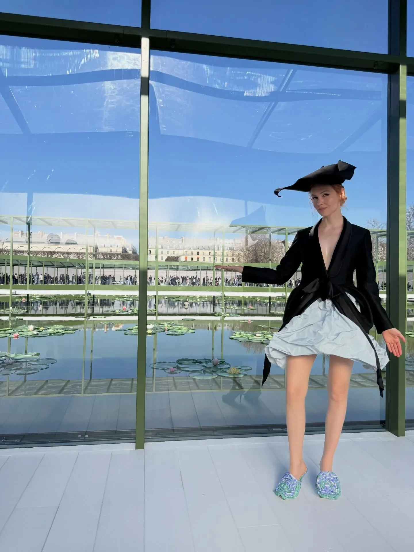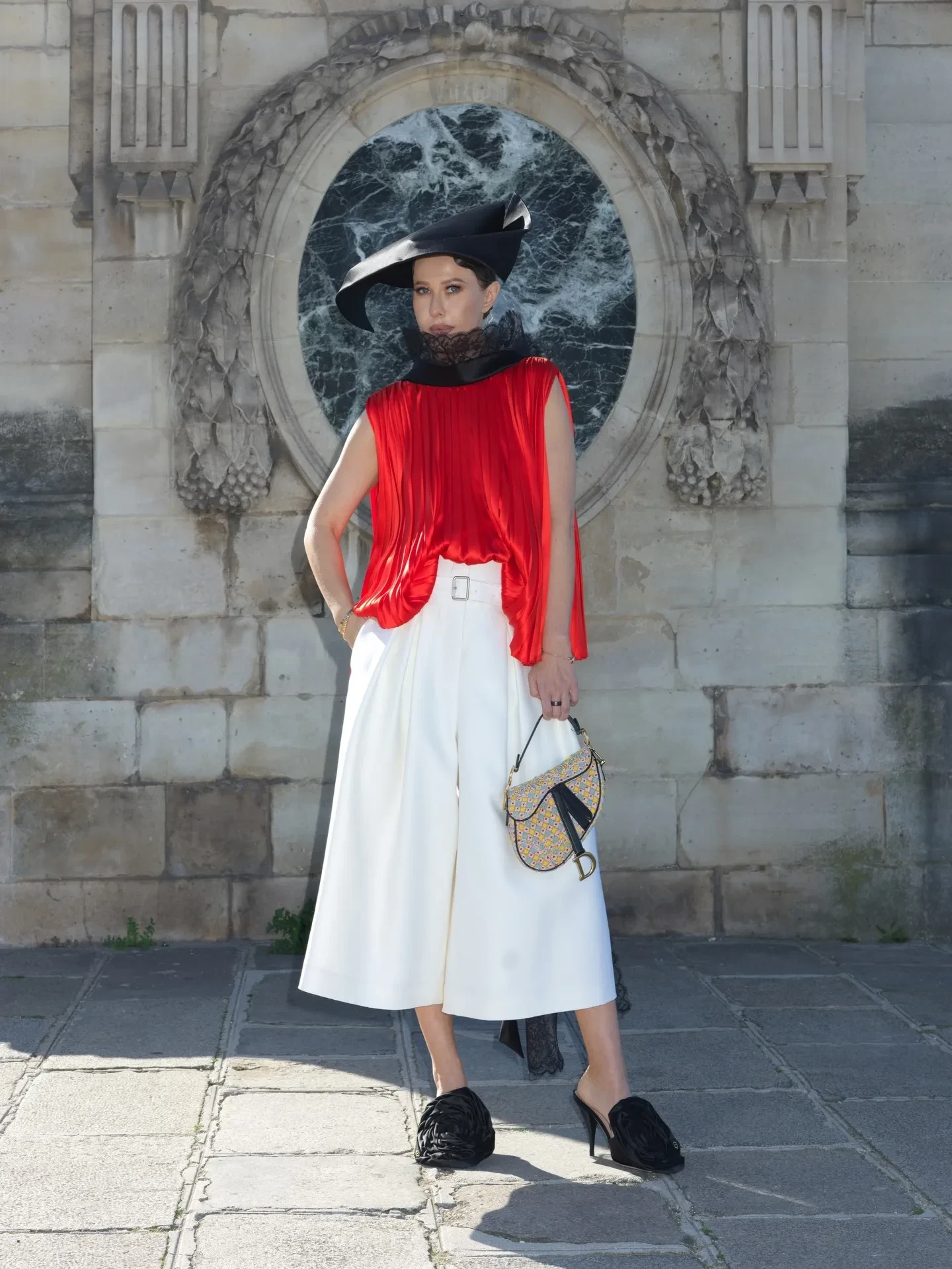 Алекса ЧангКсения Собчак и Ольга Карпуть, которые представляли на шоу "российский десант", не сговариваясь, собрали образы с одинаковыми шляпками и мюлями-розами на ногах. 44-летняя Собчак сочетала головной убор с алой блузкой с кружевной вуалью и белыми кюлотами, а 43-летняя Карпуть — с фактурным жакетом и "мятой" юбкой в нежно-голубом оттенке.