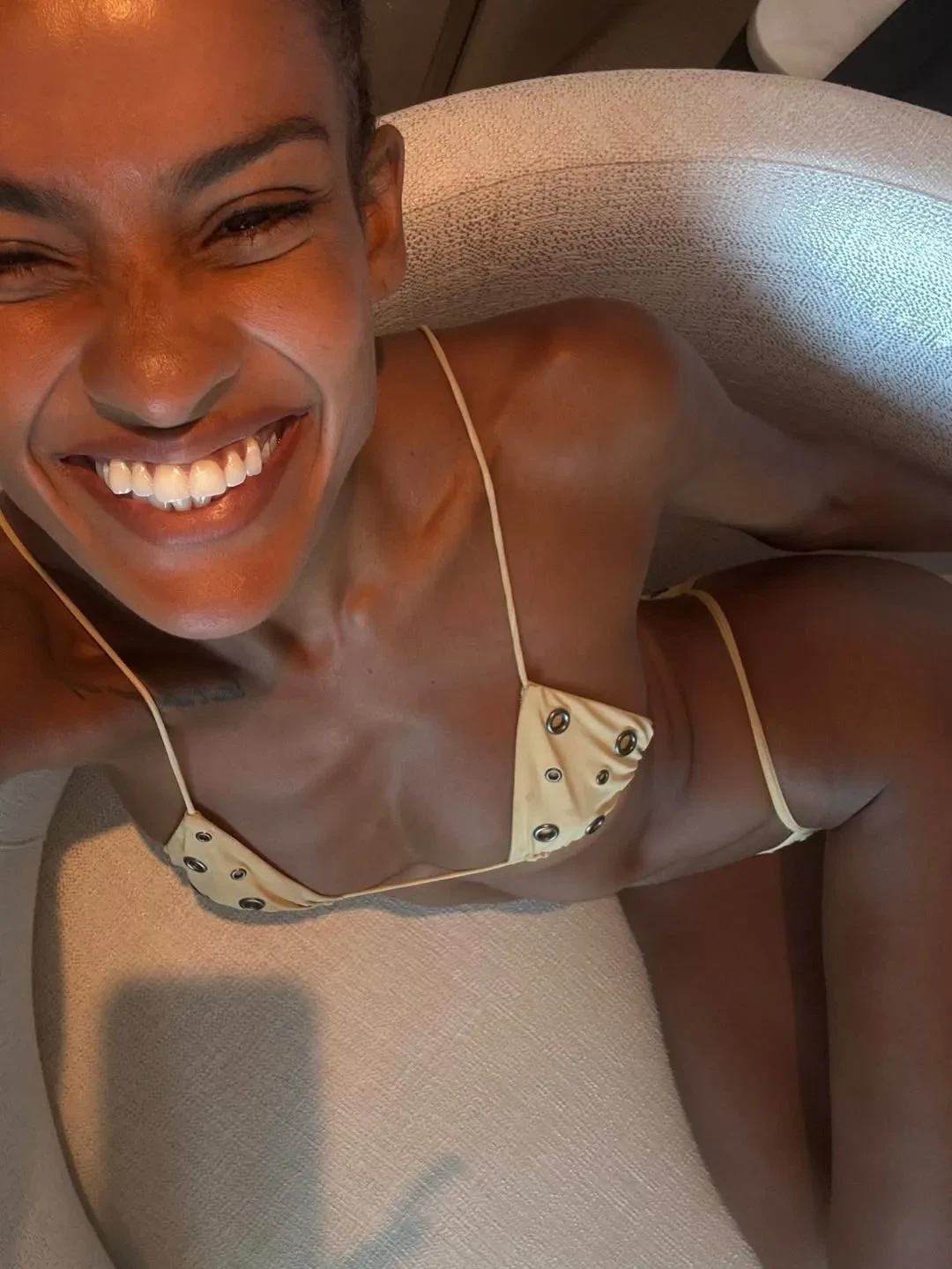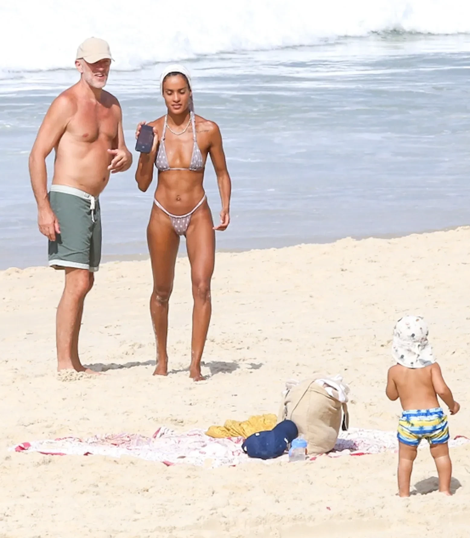 На снимках 29-летняя Нара Баптиста и французский актёр отдыхают с ребёнком на берегу океана. Модель позировала возлюбленному на камеру в бикини, пока их сын находился неподалёку. Позже семью также видели во время купания.