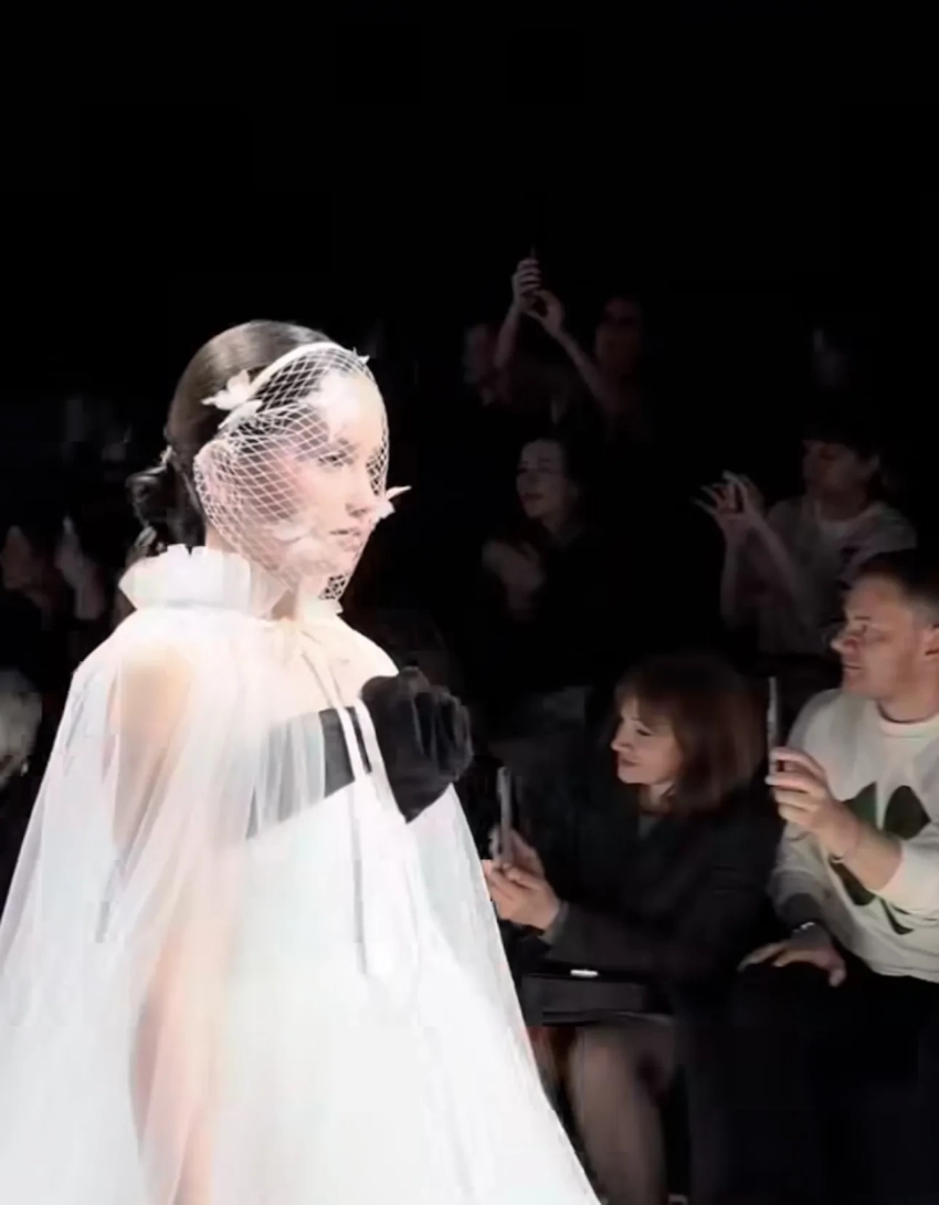 https://t.me/spletnik2006/50834Мия ПрилучнаяМия продефилировала в пышном белом платье с акцентной черной лентой, украшающей лиф. Поверх плеч была надета прозрачная накидка в пол, а лицо обрамляла вуаль в белую сетку с бабочками.