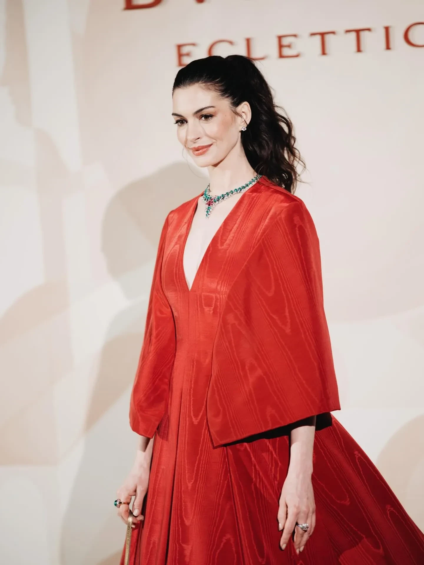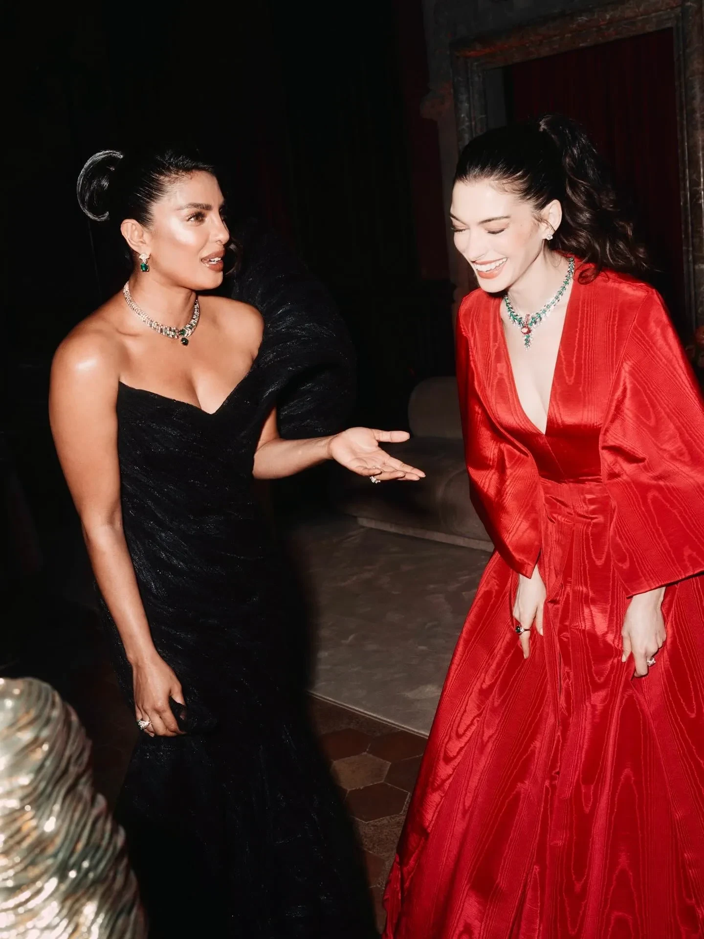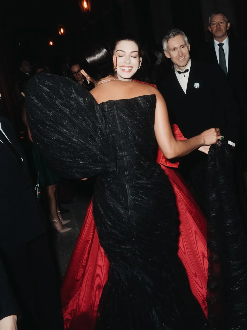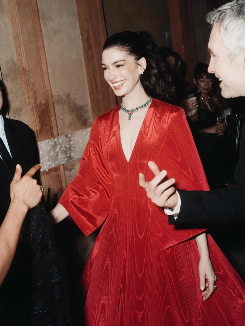 43-летняя Энн Хэтэуэй, которая, по мнению некоторых поклонников, в прошлом году решилась на пластическую операцию, выбрала для выхода в свет оригинальное красное платье с широкими рукавами, а 30-летняя Дуа Липа — чёрное бархатное платье с глубоким декольте, демонстрирующим атласный бра. Образы всех звёзд дополняли украшения Bvlgari.