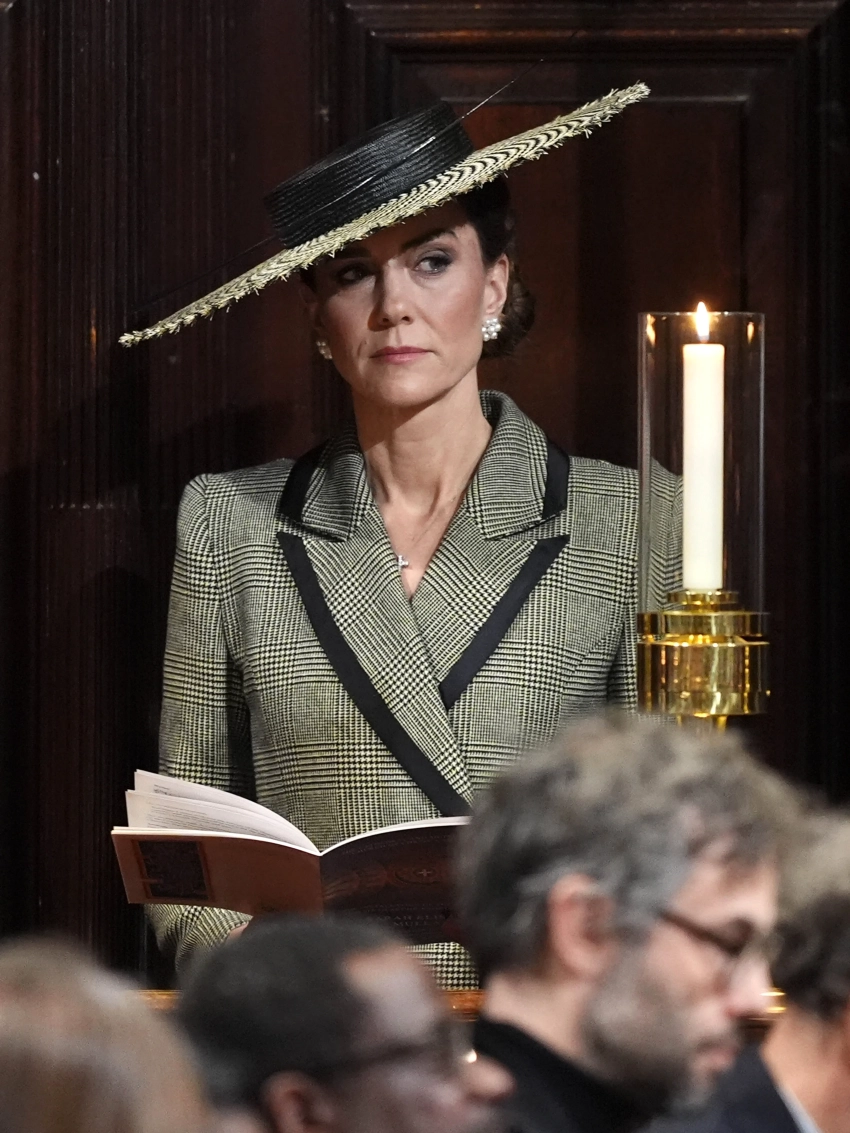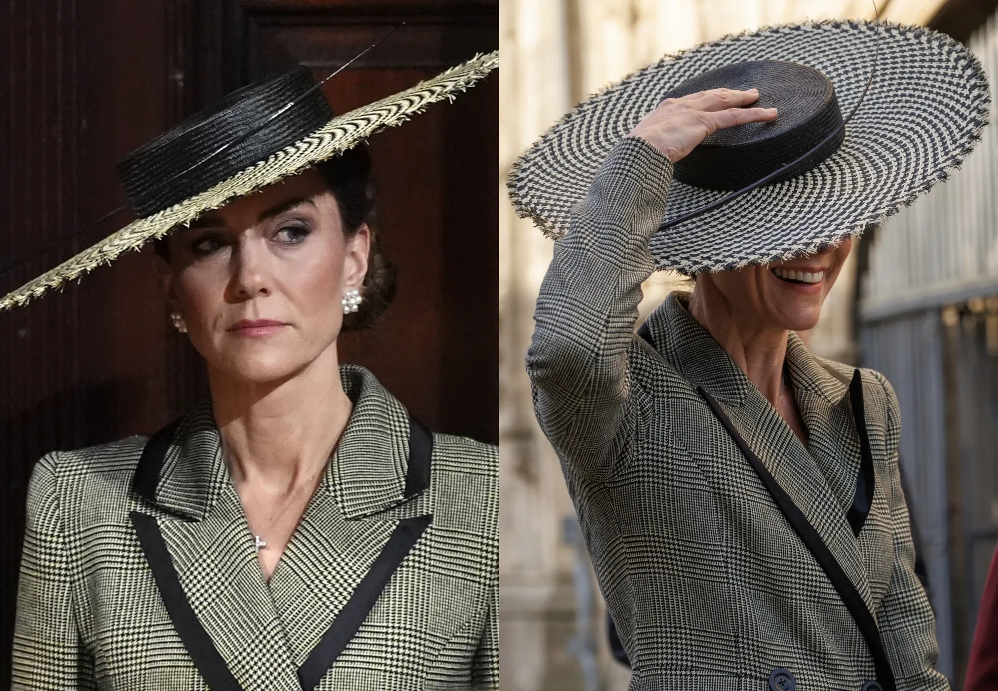 Образ, в котором принцесса прибыла в Кентерберийский собор, не оставил никого равнодушным: она была в сером клетчатом платье-пальто Suzannah London и на высоких шпильках. Наряд Кейт завершали жемчужные серьги в виде цветков и классическая сумочка от Chanel, но главным элементом выступила широкополая шляпа от английского бренда Juliette Millinery. Головной убор, который многие сравнили с фирменными шляпками первой леди США Мелании Трамп, практически полностью скрывал лицо Миддлтон и из-за сильного ветра то и дело норовил улететь — принцессе приходилось его придерживать.
