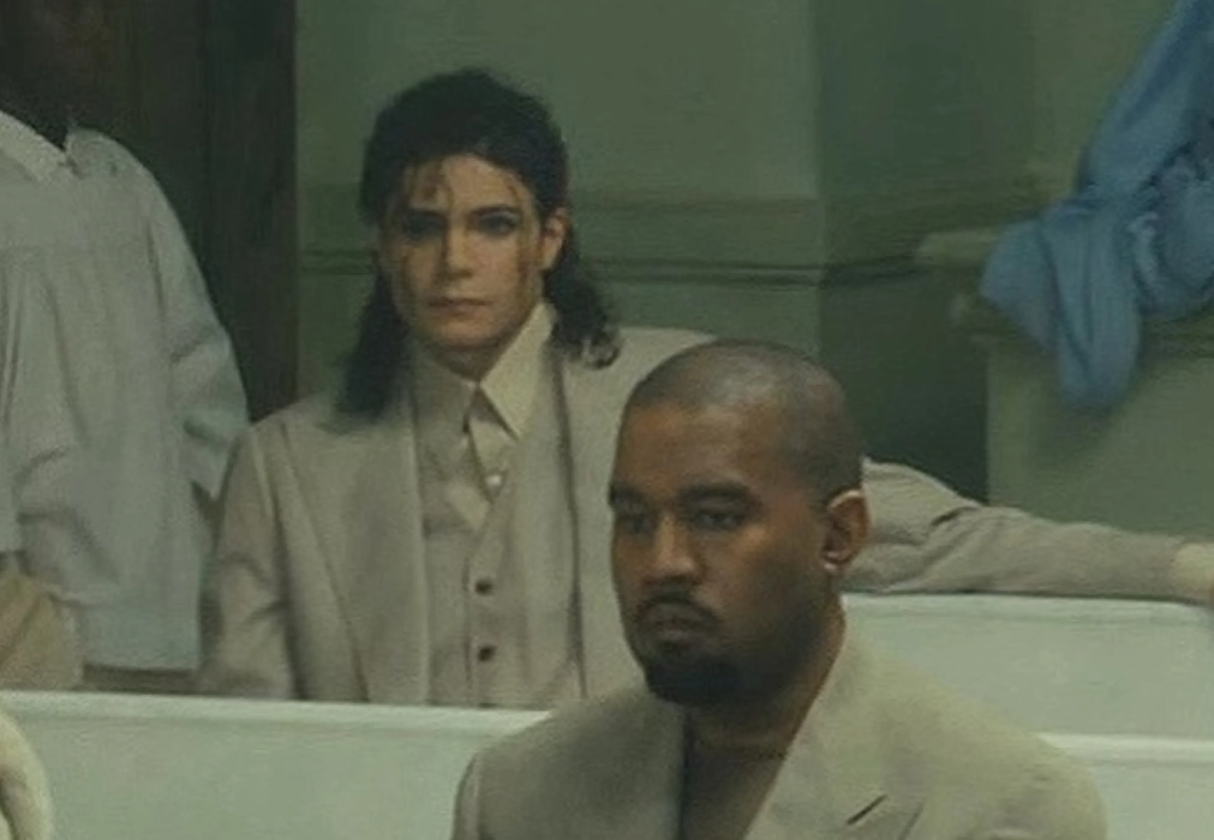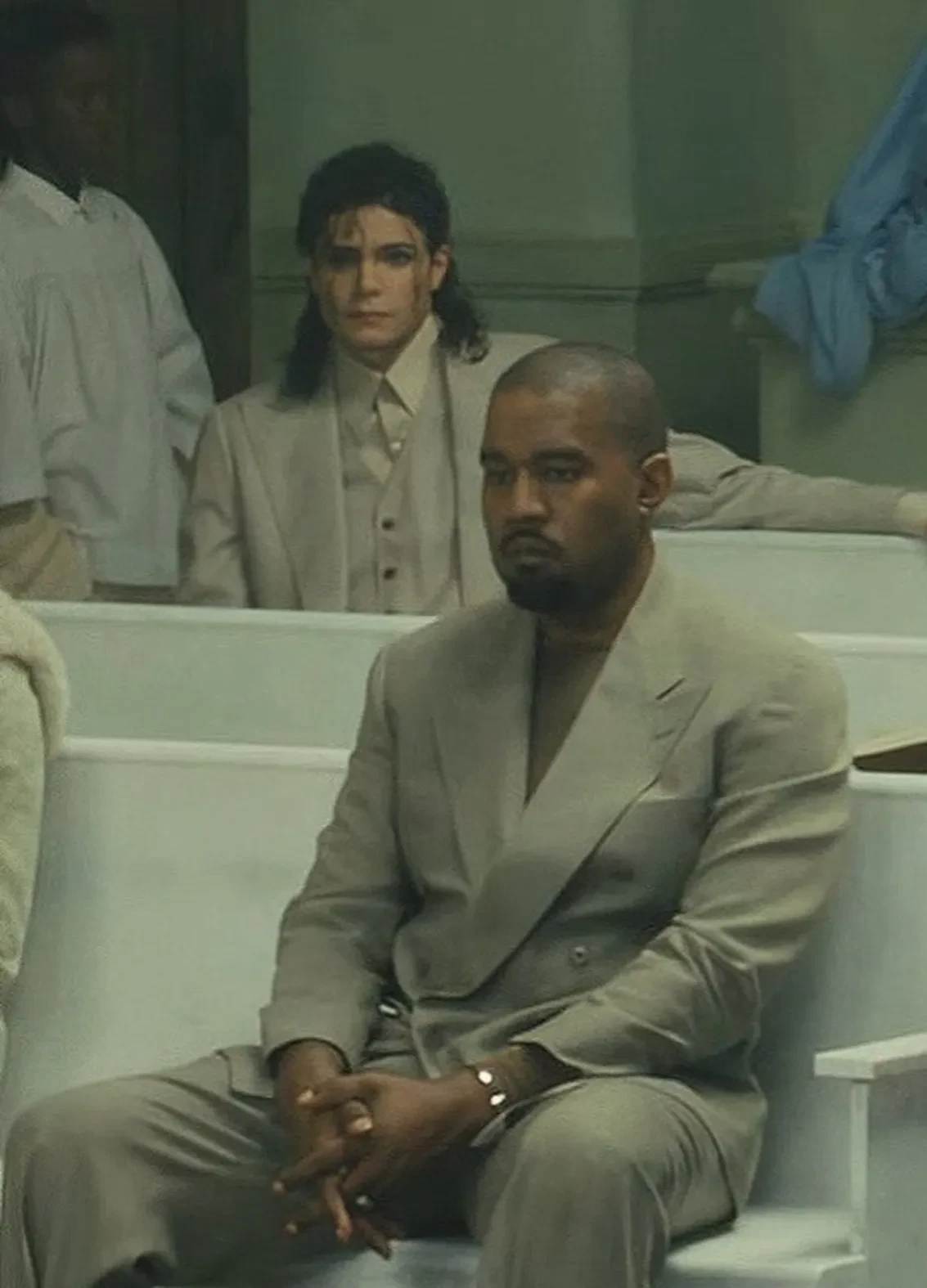 В новом клипе Канье Уэста на песню Father, которую рэпер записал совместно с Трэвисом Скоттом, поклонники заметили на фоне двойника Майкла Джексона. На протяжении всего видео он неподвижно сидит за Канье и наблюдает за происходящим в импровизированной церкви.